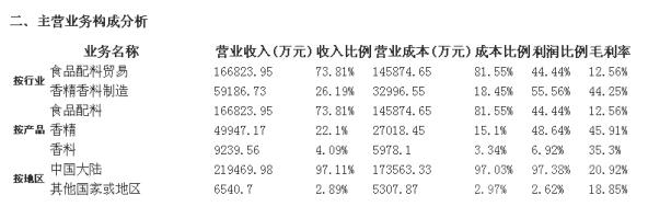從業(yè)務(wù)構(gòu)成來看,公司收入主要來源于香料香精業(yè)務(wù)和食品配料貿(mào)易,2016年公司香精香料制造營收5.9億,同比增長7.16%;營業(yè)成本3.3億元,同比增長6.5%;毛利率44.3%,與上年同期基本持平,繼續(xù)保持行業(yè)龍頭地位。另外愛普銷售的主要食品配料乳脂受益于烘焙快速發(fā)展和乳制品消費升級而快速增長,2016年該板塊營業(yè)收入16.7億元,同比增長32.5%,占公司總收入的73.2%,另外,還并入了工業(yè)巧克力的研發(fā)和制造業(yè)務(wù),對食品配料業(yè)務(wù)在產(chǎn)業(yè)鏈上進(jìn)行延伸。