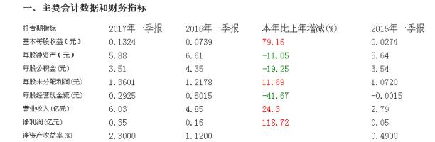公司2017年1-3月實現(xiàn)營業(yè)收入6.03億元,同比增長24.39%,歸屬于上市公司股東的凈利潤3469.14萬元,同比增長116.79%,